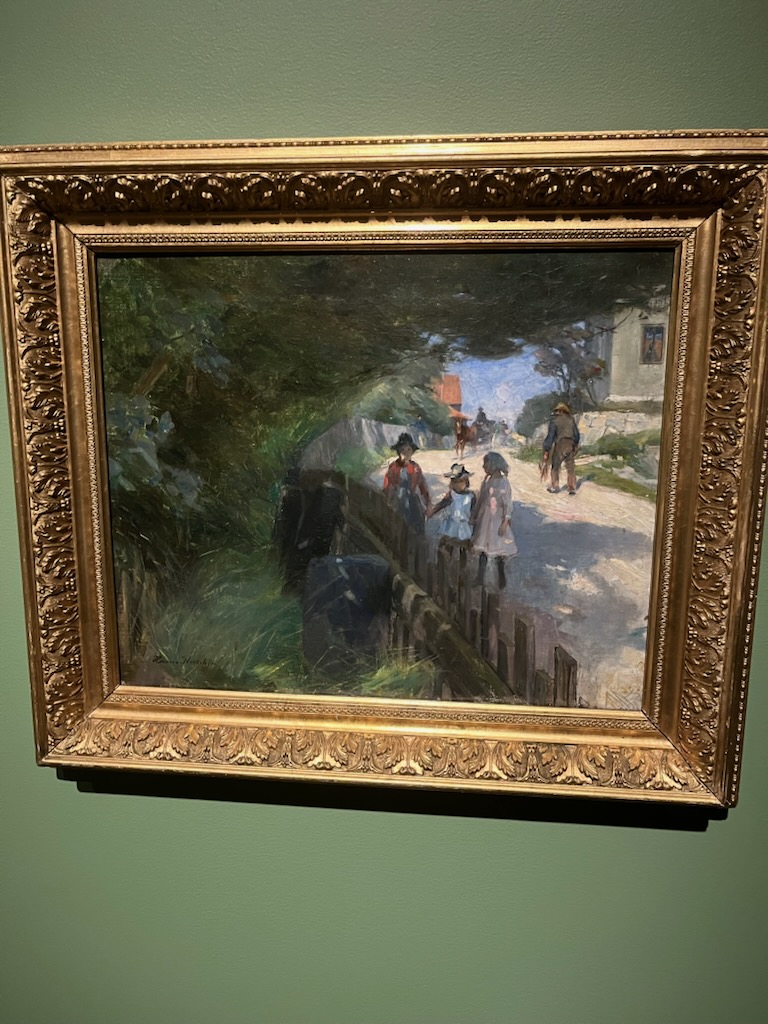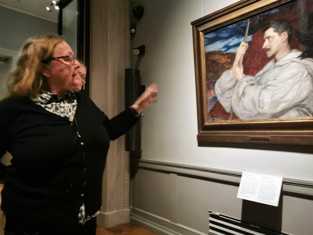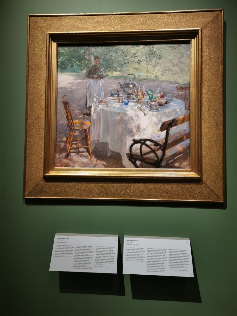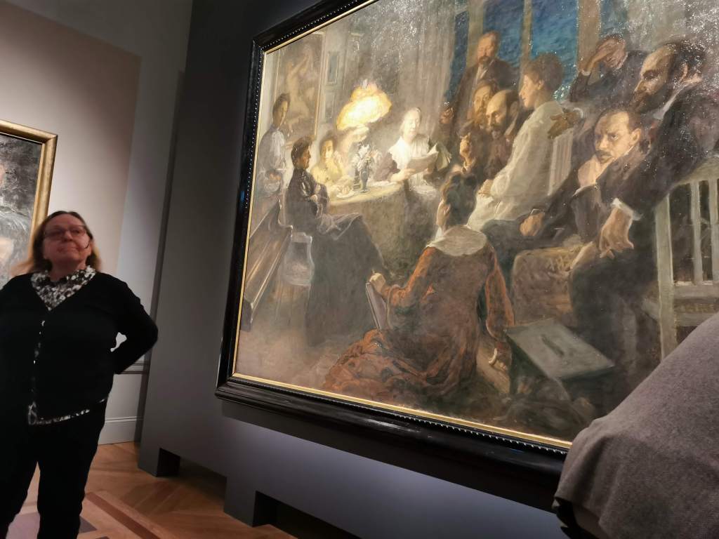 Vår nästa aktivitet var en mycket uppskattad guidad visning av Hanna Pauli utställningen på Nationalmuseet. Den är populär och drar mycket folk. Men vår guide föste undan alla andra så vi som hade bokad visning kunde sitta längst fram och lyssna på hennes intressanta beskrivning av de olika verken