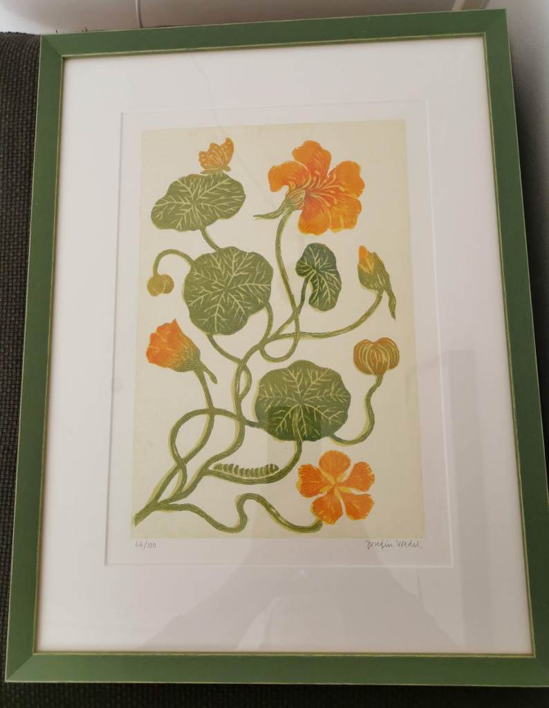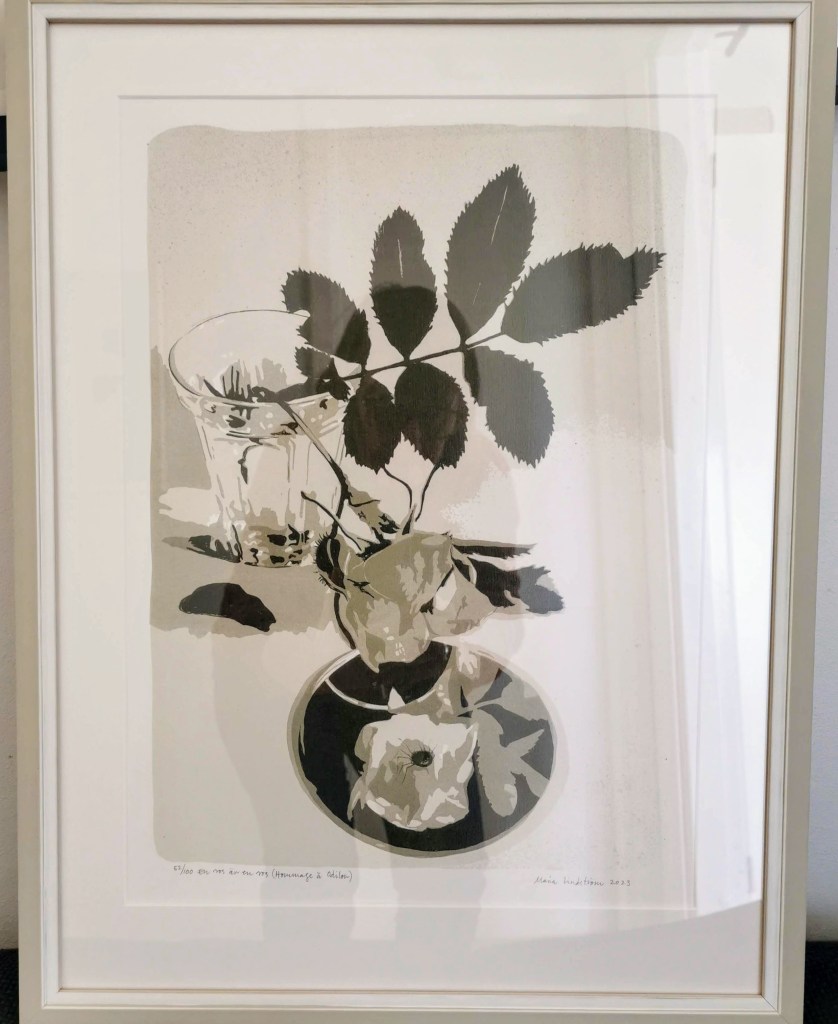 1. ”Fagerudd” Ingvar Landberg, serigrafi 30×40 cm. Ingvar Landberg har, förutom att vara verksam som konstnär, drivit en tryckeriateljé med seriegrafiteknik i många år.2. ”Blomsterkrasse” Josefin Wedel träsnitt 20×30 cm. Josefin Wedel är en Leksandsb aserad konstnär bl a utbildad vid Gerleborgsskolan representerad i ett flertal kommuner och regioner.3. ”En ros är en ros”, Maria Lindström litografi 27×38 cm. Konstnär verksam i Stockholm bl a utbildad vid Konstfack och Grafikskolan i Stockholm. Verket är inspirerat av en dikt av Gertrud Stein.4.”Granskogen”, Anette Hammarén etsning 15×13 cm. Utbildad vid bl a Konstfack och Kungliga Konsthögskolan Stockholm. Hennes motiv finner hon oftast i naturen kring där hon bor och verkar norr om Stockholm.